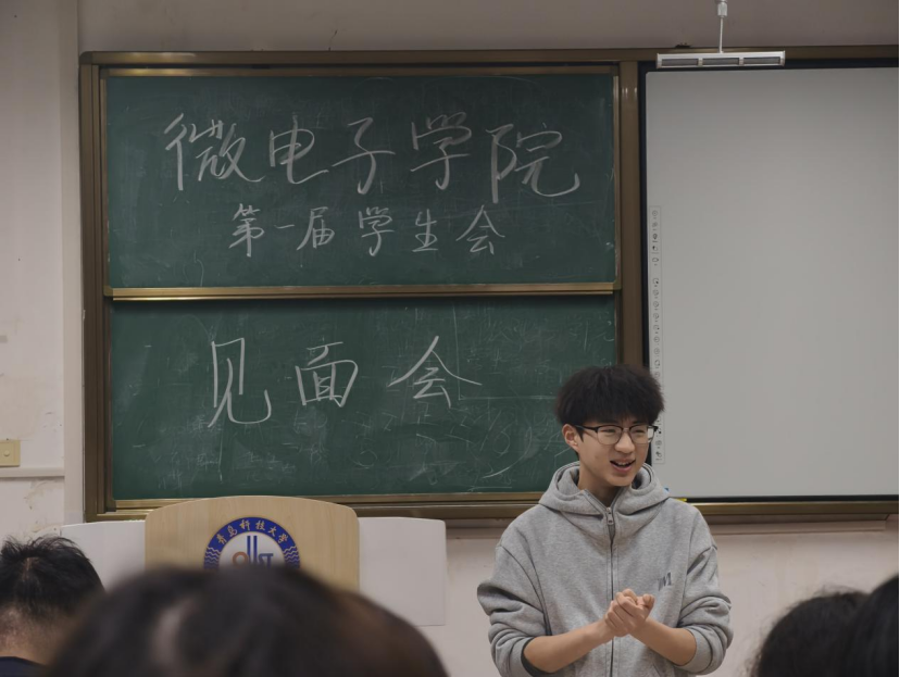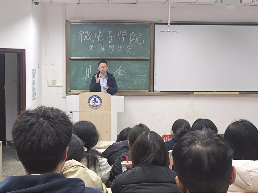 微电子学院学生会指导老师曲智强发表讲话。他首先对学院第一届学生会的顺利组建与本次见面会的成功举办表示热烈祝贺,结合学院学科特色与人才培养核心目标,对学生会的职能定位、主责主业与发展方向提出了明确要求与殷切期望。他强调,学生会是联系学院与广大同学的桥梁和纽带,全体成员要始终牢记全心全意为同学服务的根本宗旨,脚踏实地、履职尽责,真正把为同学办实事、解难题落到实处,在服务集体、助力成长的过程中锤炼品格、提升综合能力,努力成长为可堪大用、能担重任的新时代青年骨干。